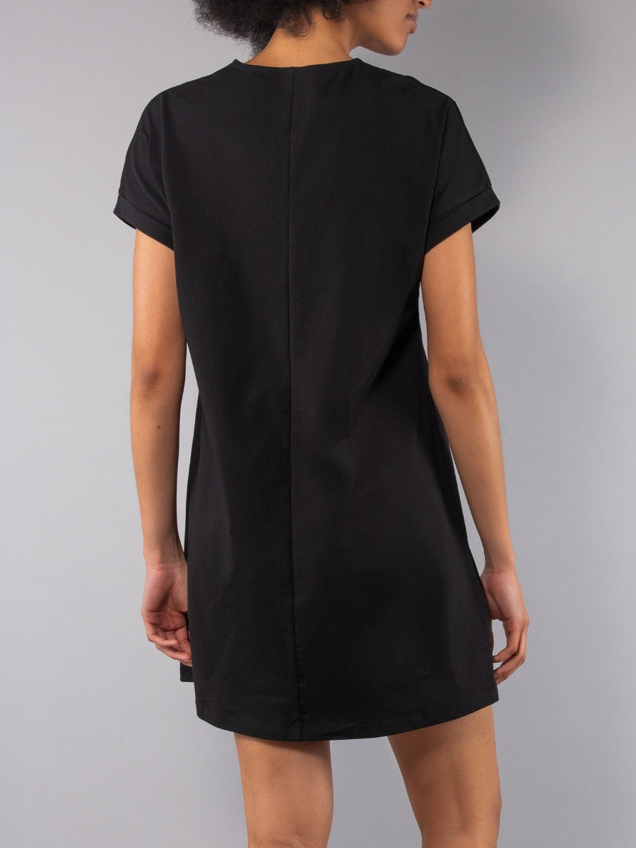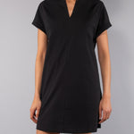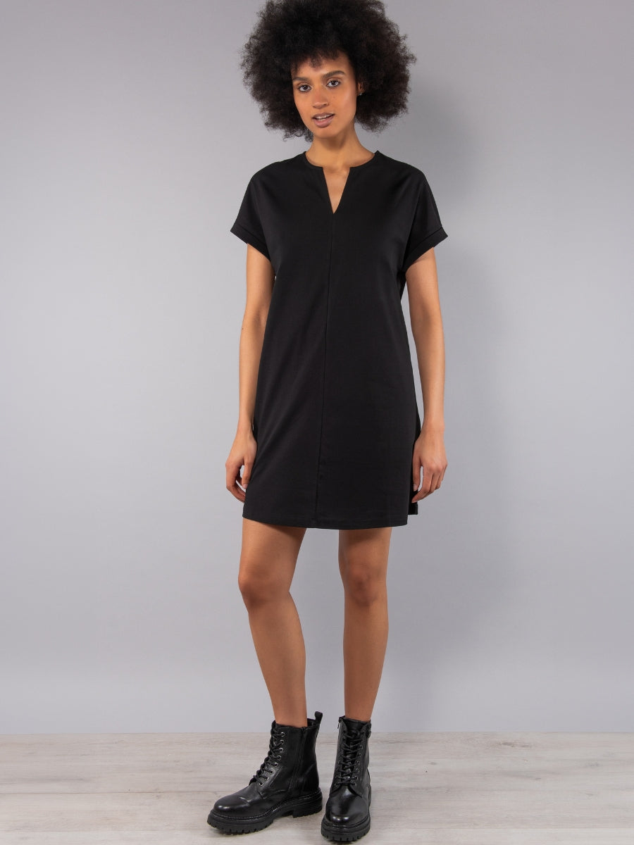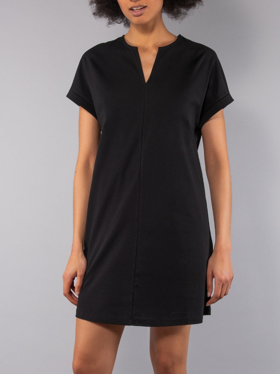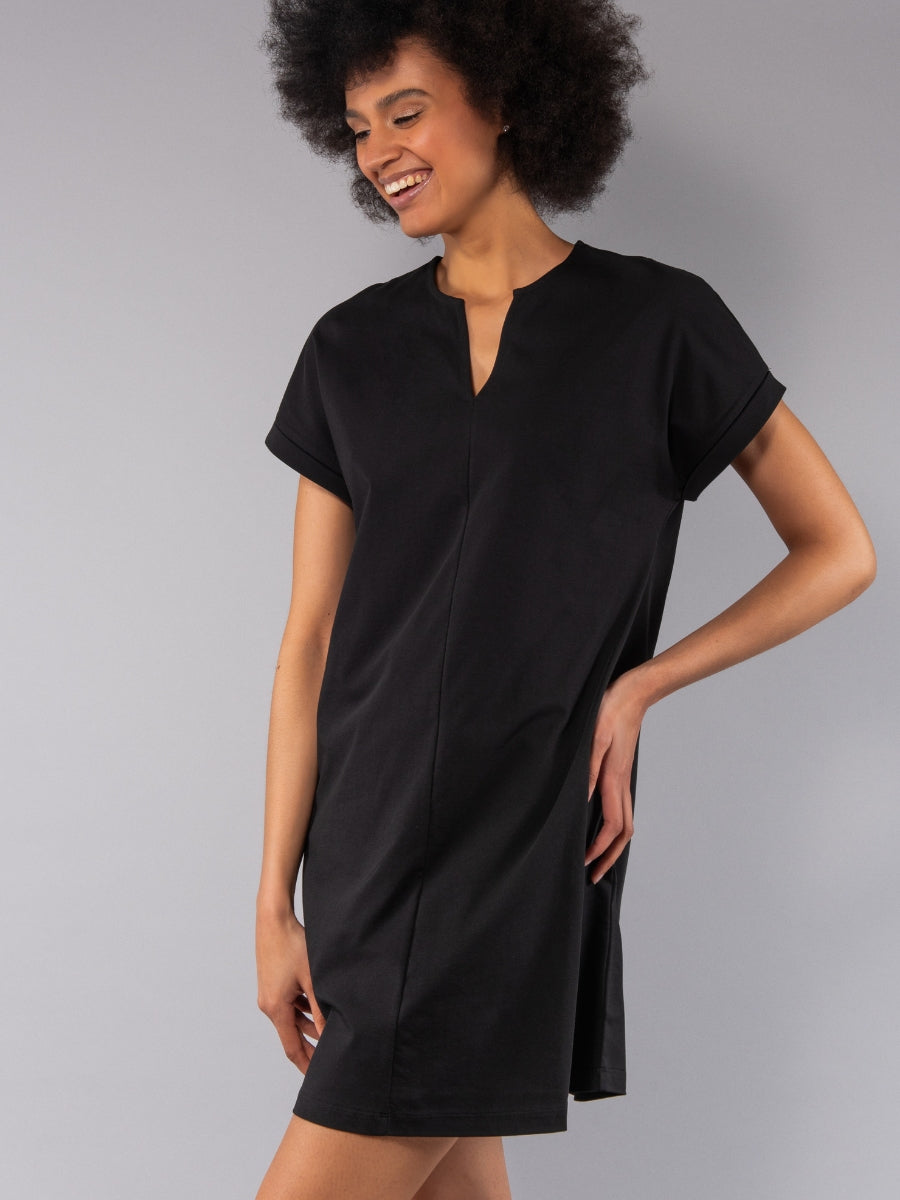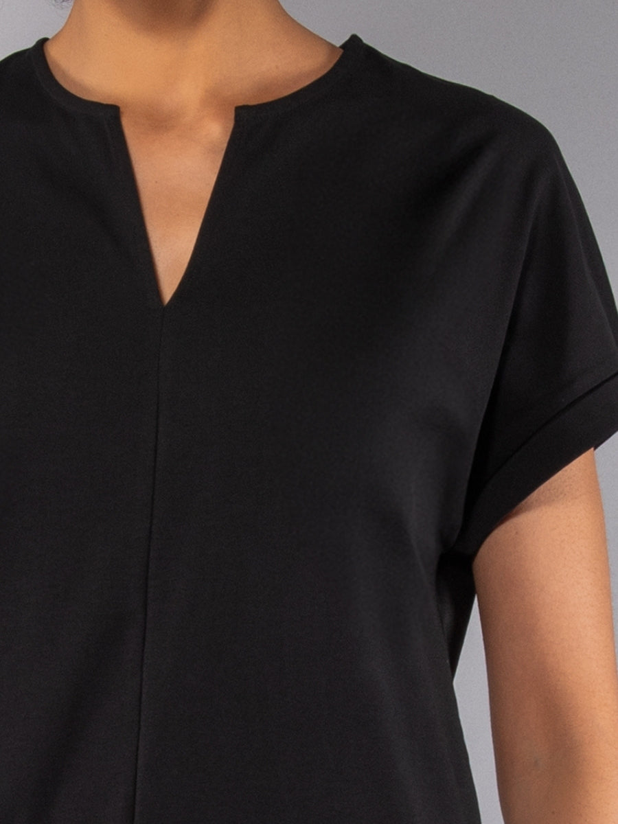Kaftano corto a tinta unita dal design essenziale e contemporaneo. Il modello si distingue per lo scollo tondo rifinito da un piccolo spacco a V e per le maniche corte con risvolto. Una cucitura centrale, fronte e retro, ne valorizza la linea dritta e scivolata. Un capo easywear estremamente versatile, ideale per creare look estivi quotidiani con semplicità.