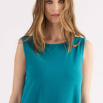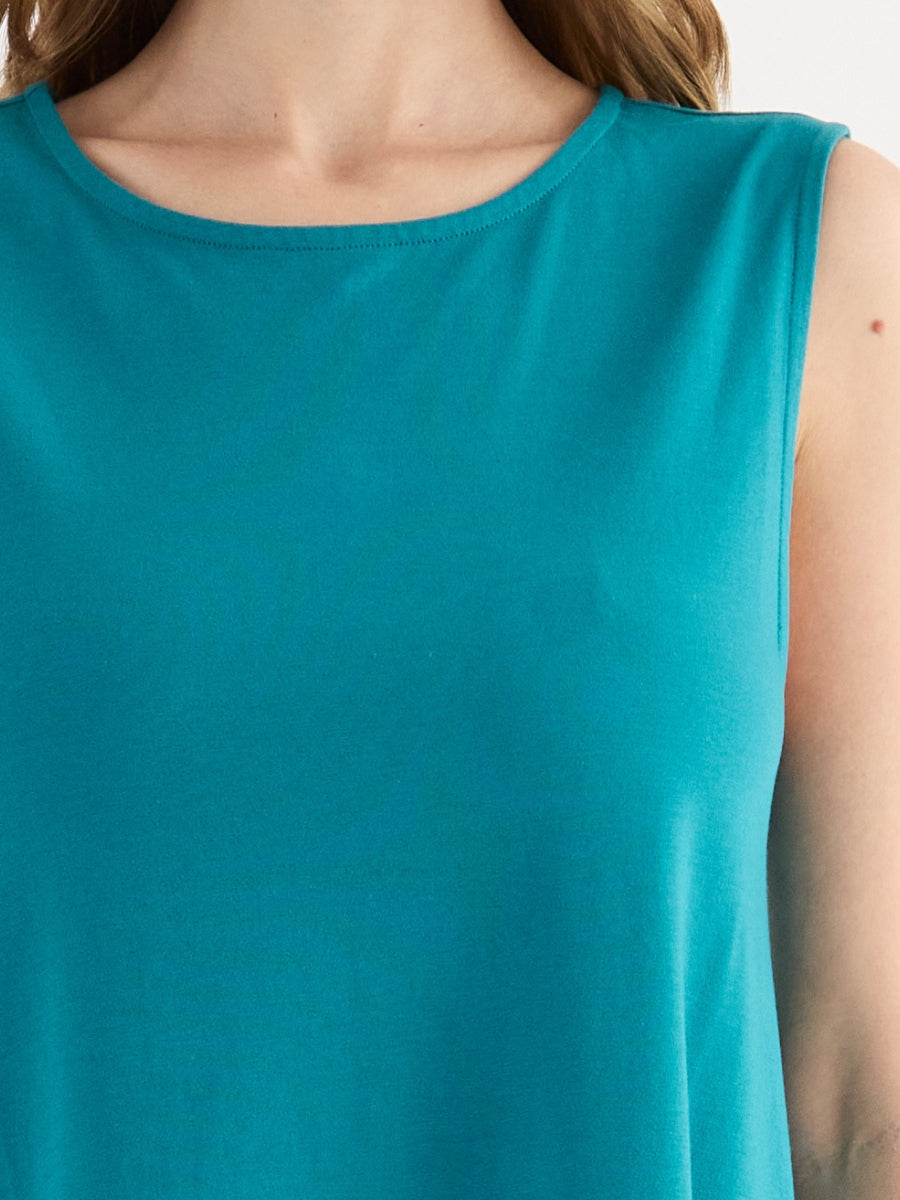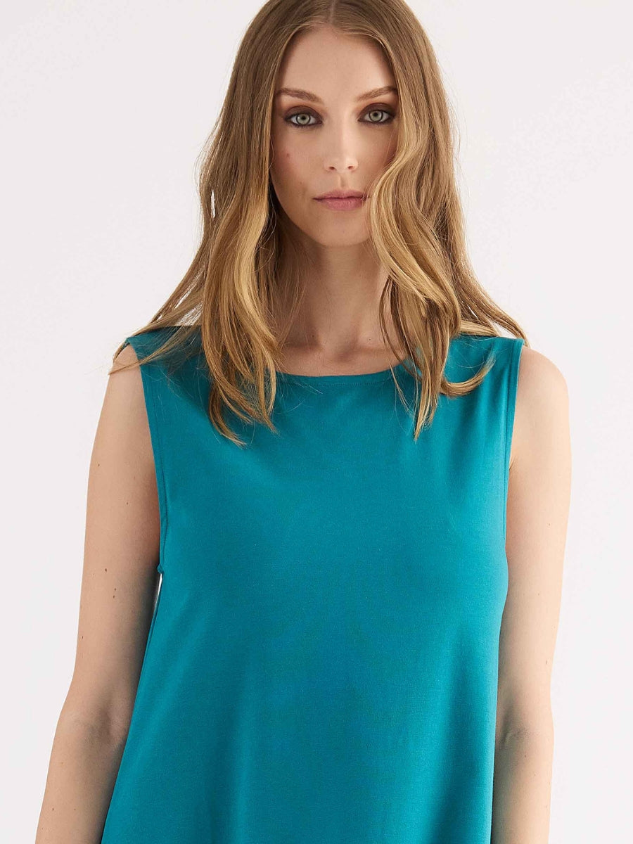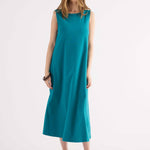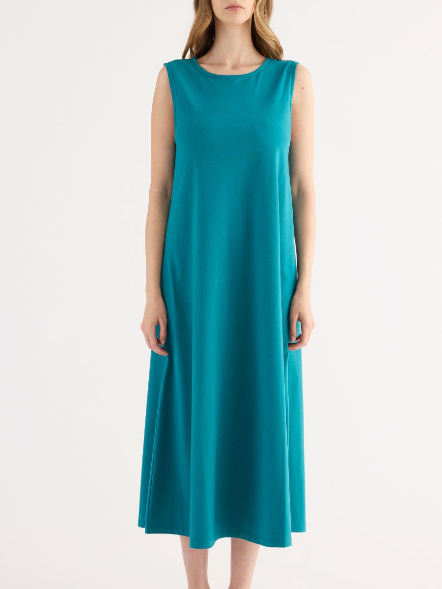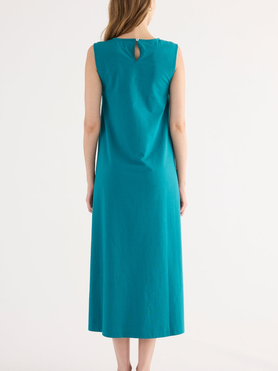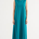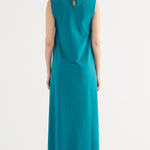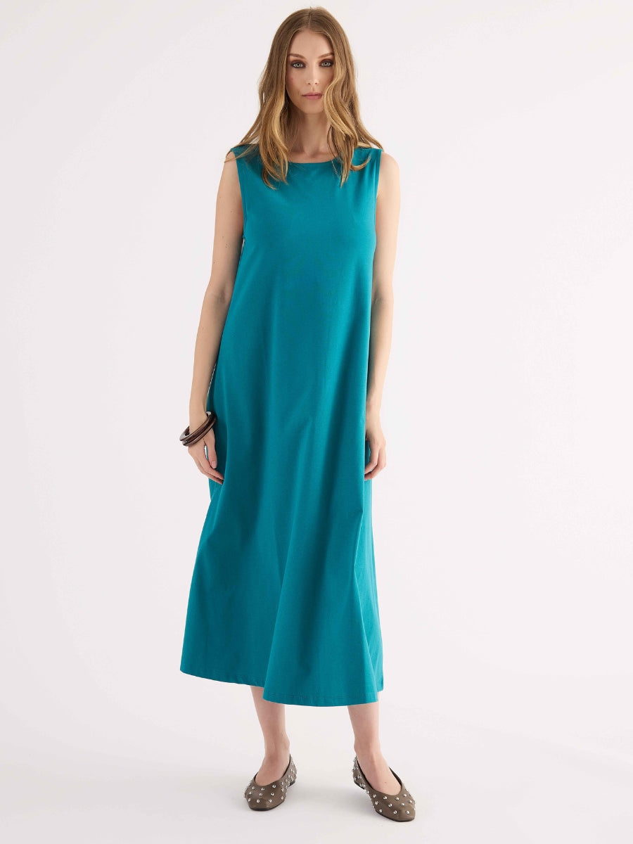 Abito lungo smanicato a tinta unita, caratterizzato da un design easywear raffinato e minimale. Il modello si distingue per l'elegante scollo a barchetta e per la chiusura sul retro con bottone, che crea un delicato dettaglio a oblò sulla schiena. La linea lunga e scivolata, unita alla morbidezza del tessuto, assicura una vestibilità impeccabile e comoda. Un abito raffinato versatile, perfetto per ogni occasione primaverile ed estiva.