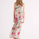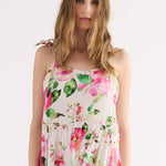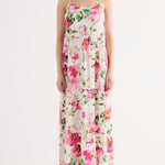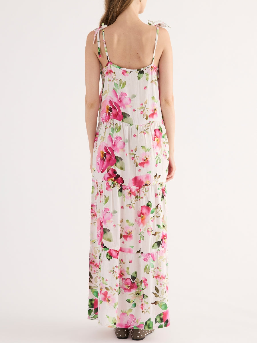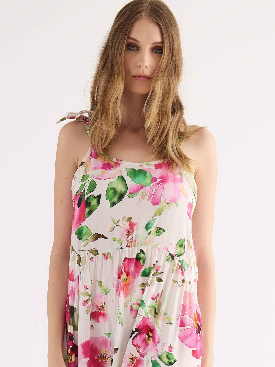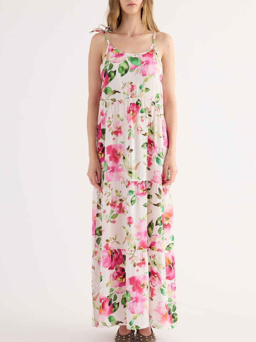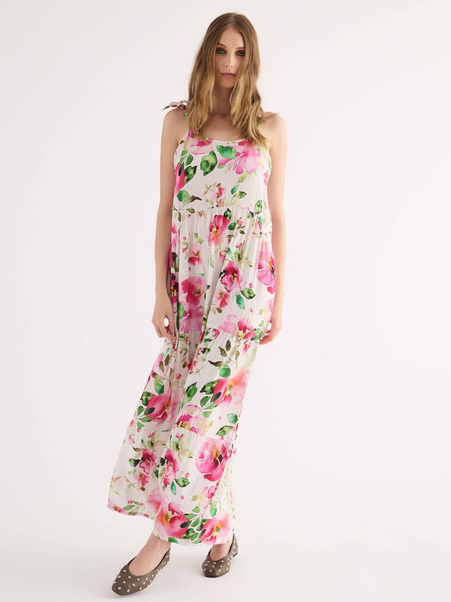 Abito lungo realizzato in leggera viscosa, caratterizzato da una vivace stampa macro floreale e da un design a balze che dona volume e movimento al capo. Il modello presenta spalline sottili regolabili con fiocco, scollo tondo e una silhouette morbida e fluida. Un vestito dal gusto romantico, perfetto per occasioni speciali o per look quotidiani raffinati.