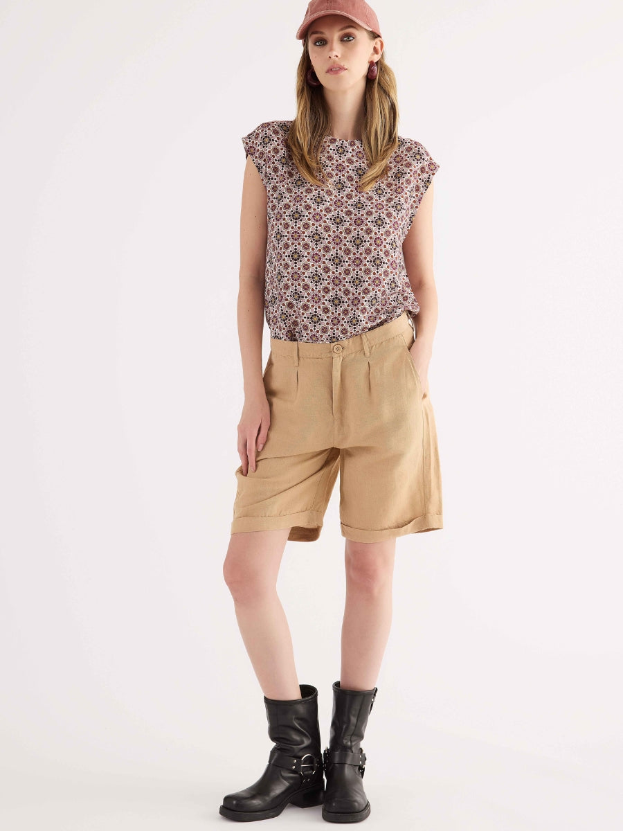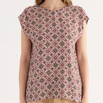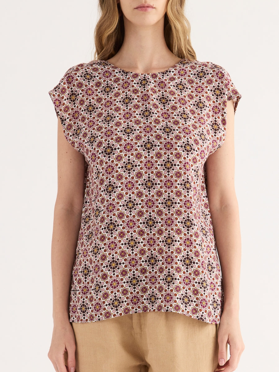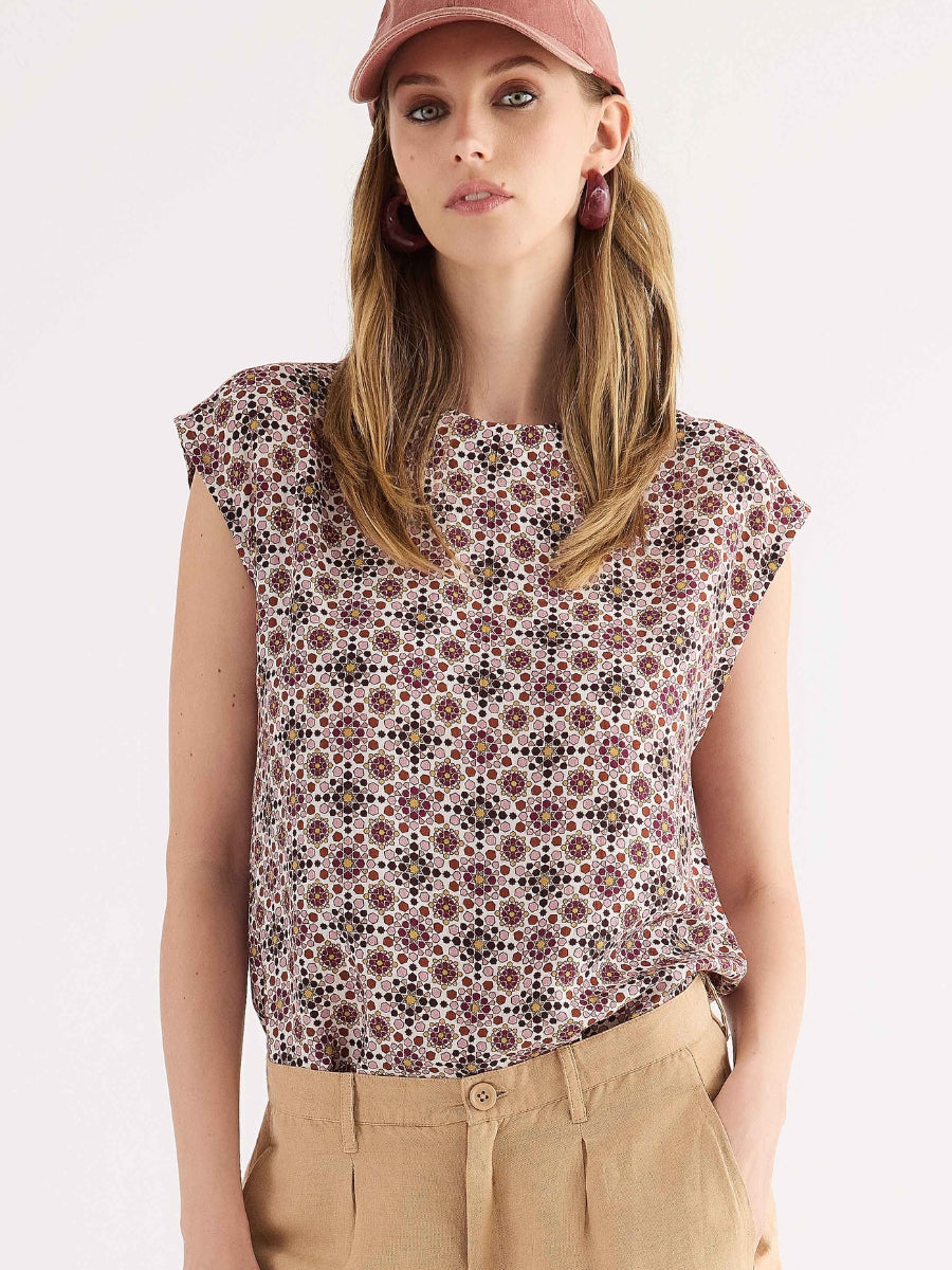 Blusa realizzata in fluida e leggera viscosa, caratterizzata da una particolare stampa geometrica dall'effetto optical mosaico. Il modello presenta un design pulito ed essenziale con scollo tondo e spallina ampia morbida. Un capo versatile e moderno, perfetto per aggiungere personalità ai look quotidiani.