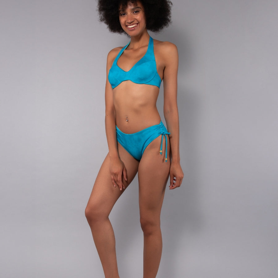 Slip fisso con fianco leggermente alto, arricchito da laccetti laterali non removibili che possono essere annodati a piacimento per personalizzare l'altezza del fianco, creando un delicato effetto arricciato. Il modello presenta un design double face che permette di indossare il capo da entrambi i lati, scegliendo tra due diverse varianti colore, ed è completato da accessori oro. La linea essenziale e confortevole dello slip si adatta alla silhouette valorizzandola e assicurando il massimo comfort.