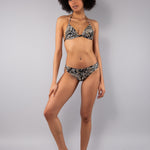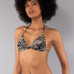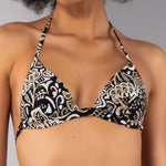 Triangolo imbottito caratterizzato da un'esclusiva stampa etnica a contrasto. Il modello è double-face per offrire versatilità di look ed è dotato di coppe imbottite che modellano il seno con naturalezza, garantendo un fit confortevole grazie all'allacciatura regolabile e all'assenza di ferretto.