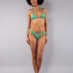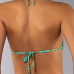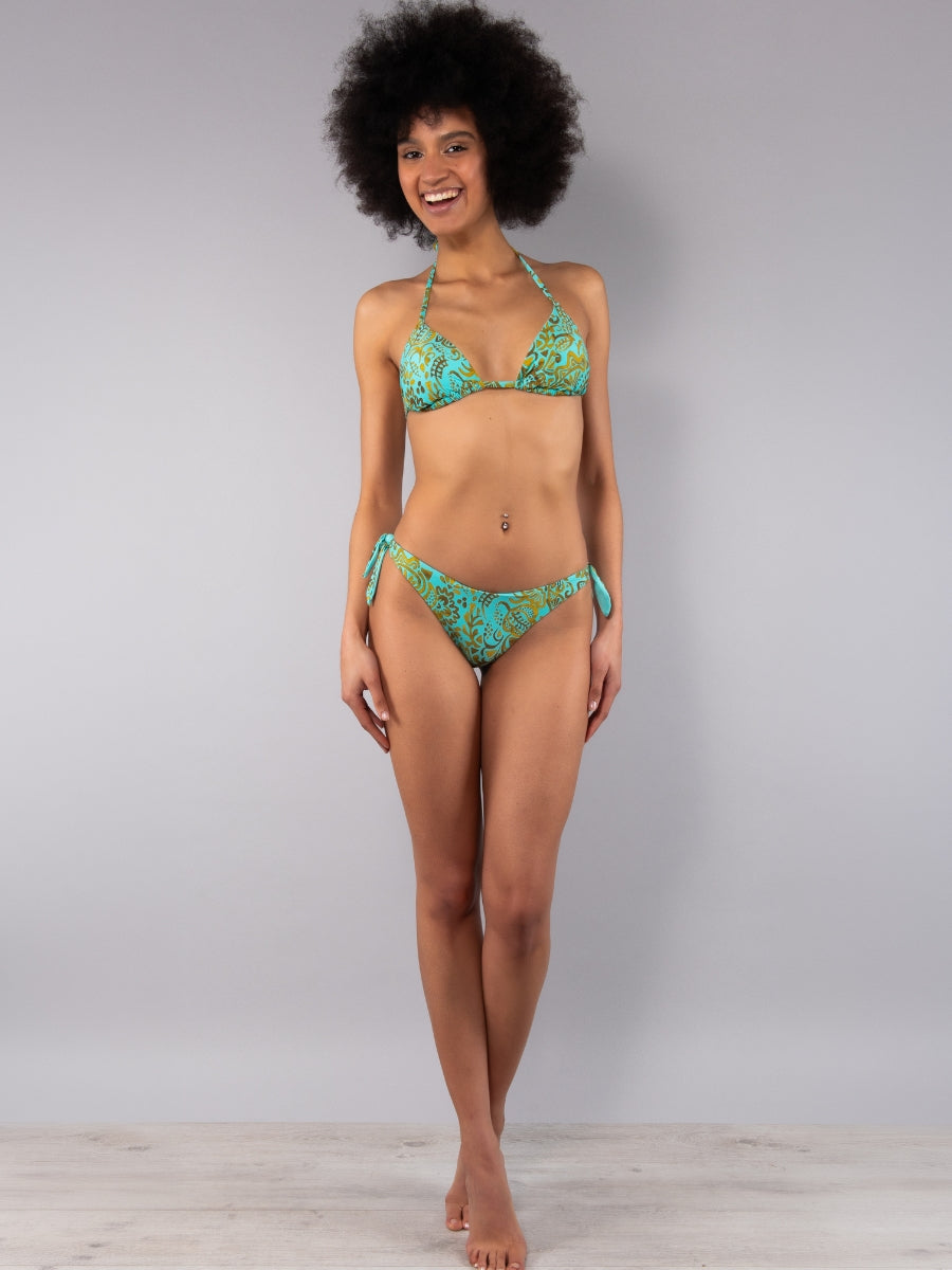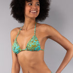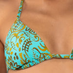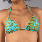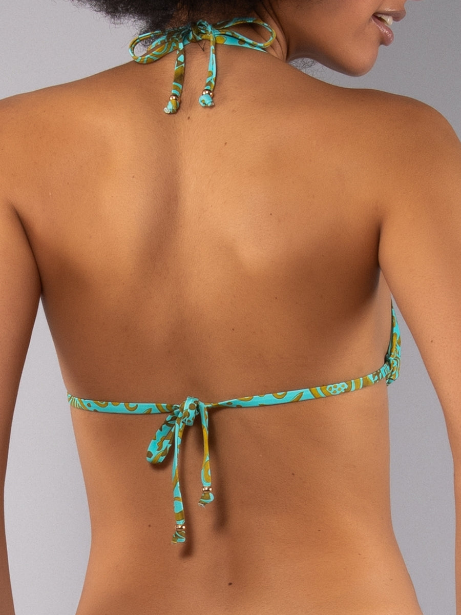 Triangolo con coppe imbottite caratterizzato da un'esclusiva stampa etnica a contrasto. Il modello è dotato di coppe imbottite estraibili che modellano delicatamente il décolleté, mentre l’assenza di ferretto e l’allacciatura regolabile garantiscono un fit confortevole.