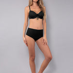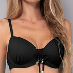 Reggiseno con coppe imbottite, progettato per garantire comfort e supporto alle coppe differenziate C. La struttura è dotata di ferretto che sostiene il décolleté, mentre l’imbottitura modella le forme con eleganza. Chiusura sul retro con gancio e spalline regolabili. Il design del costume da bagno è completato dal centroseno con incrocio di laccetti e accessori gold.