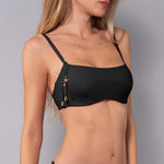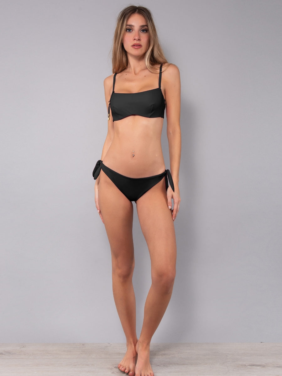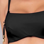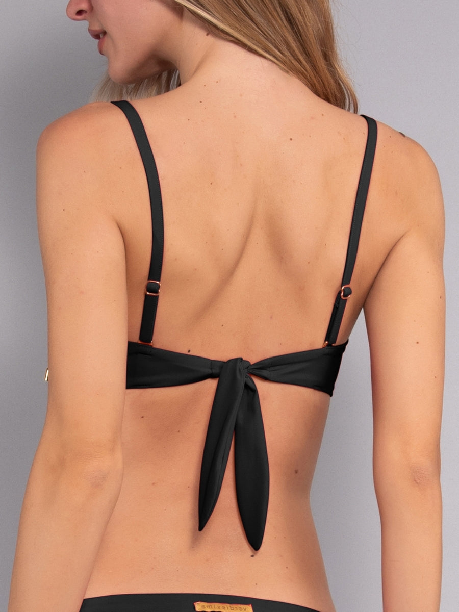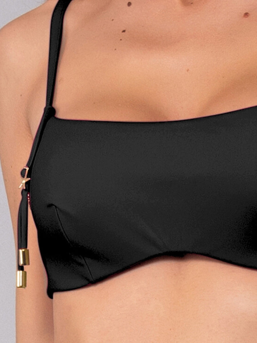 Top con ferretto, progettato per garantire comfort e supporto alle coppe differenziate C. La struttura è dotata di ferretto invisibile che sostiene il décolleté, mentre l’assenza di imbottitura assicura una vestibilità comoda. Allacciatura sul retro e spalline regolabili. Il design del costume da bagno è completato dal accessori gold che aggiungono un tocco di luce.