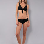 Top bikini modello triangolo alto, progettato per offrire comfort e sostegno alle coppe C e D. La struttura è dotata di coppe imbottite estraibili che modellano delicatamente il décolleté, mentre l'assenza di ferretto assicura la massima comodità. Il design è caratterizzato da un laccetto regolabile al centroseno e accessori gold. Allacciatura regolabile sulla schiena e spallina superiore dotata di asola finale.