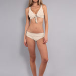 Triangolo alto progettato per offrire comfort e sostegno alle coppe C e D. La struttura è dotata di coppe imbottite estraibili che modellano delicatamente il décolleté, mentre l'assenza di ferretto assicura la massima comodità. Il design è caratterizzato da un laccetto regolabile al centroseno e accessori gold. Allacciatura regolabile sulla schiena e spallina superiore dotata di asola finale.