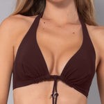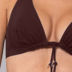 Triangolo alto regolabile progettato per garantire comfort e sostegno alle coppe differenziate C e D. La struttura è priva di ferretto e di imbottiture per una vestibilità naturale e confortevole. Il design è impreziosito da accessori gold al centroseno