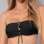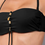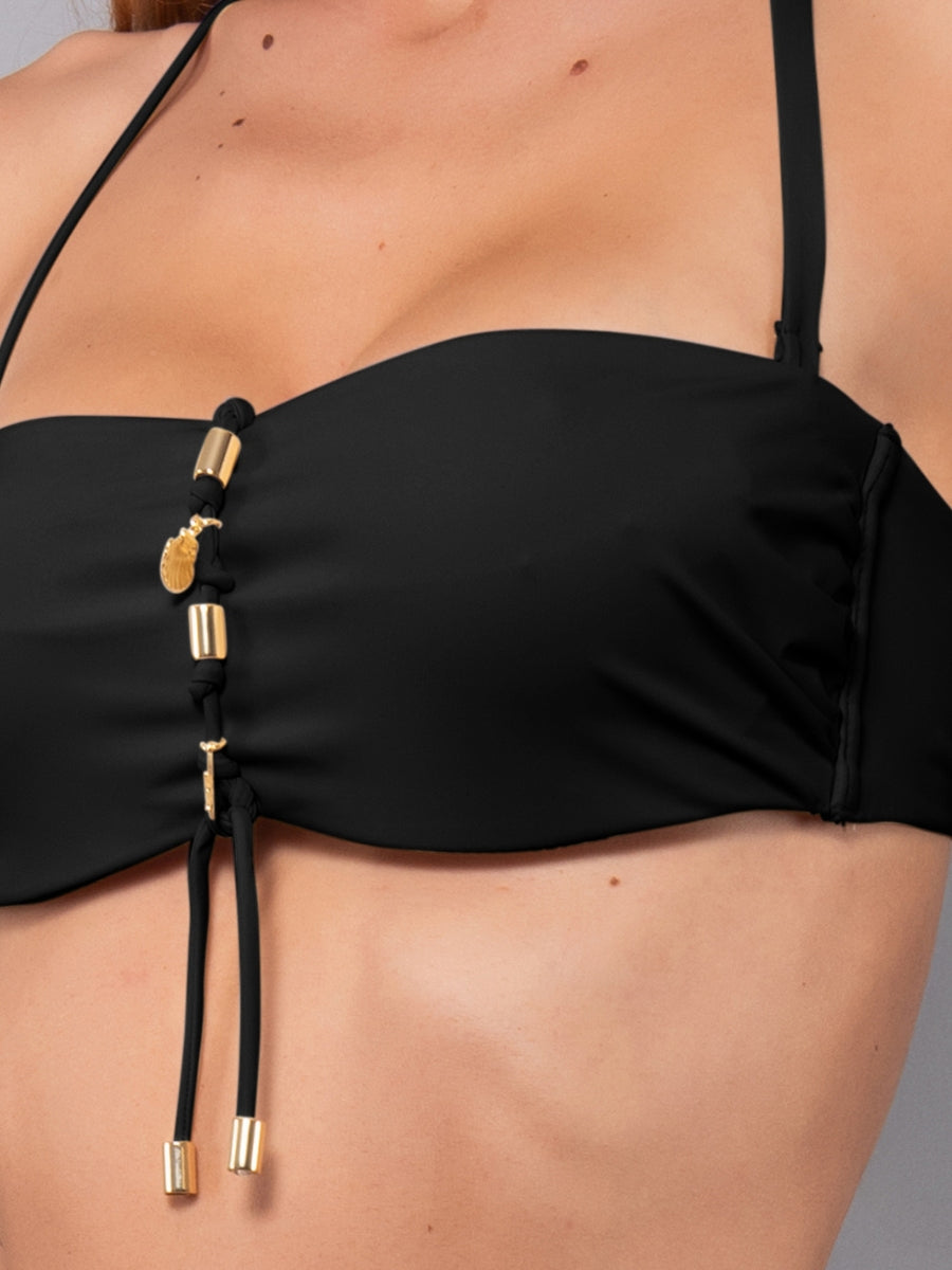 Fascia non imbottita progettata per garantire comfort e supporto alle coppe differenziate C, D, E. La struttura è dotata di ferretto invisibile che sostiene il décolleté, mentre l’assenza di imbottitura assicura una vestibilità comoda e naturale. Allacciatura sul retro con gancio e spalline removibili. Il design del costume da bagno è completato dal accessori gold al centroseno.