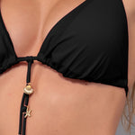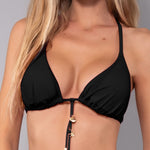 Triangolo imbottito scorrevole progettato per garantire comfort e una vestibilità naturale alle coppe differenziate C e D. La struttura è priva di ferretto e dotata di coppe con imbottitura estraibile che modellano delicatamente il décolleté, assicurando la massima comodità. Il design è impreziosito da accessori gold al centroseno