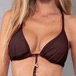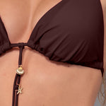Triangolo imbottito scorrevole progettato per garantire comfort e una vestibilità naturale alle coppe differenziate C e D. La struttura è priva di ferretto e dotata di coppe con imbottitura estraibile che modellano delicatamente il décolleté, assicurando la massima comodità. Il design è impreziosito da accessori gold al centroseno