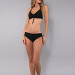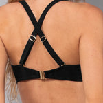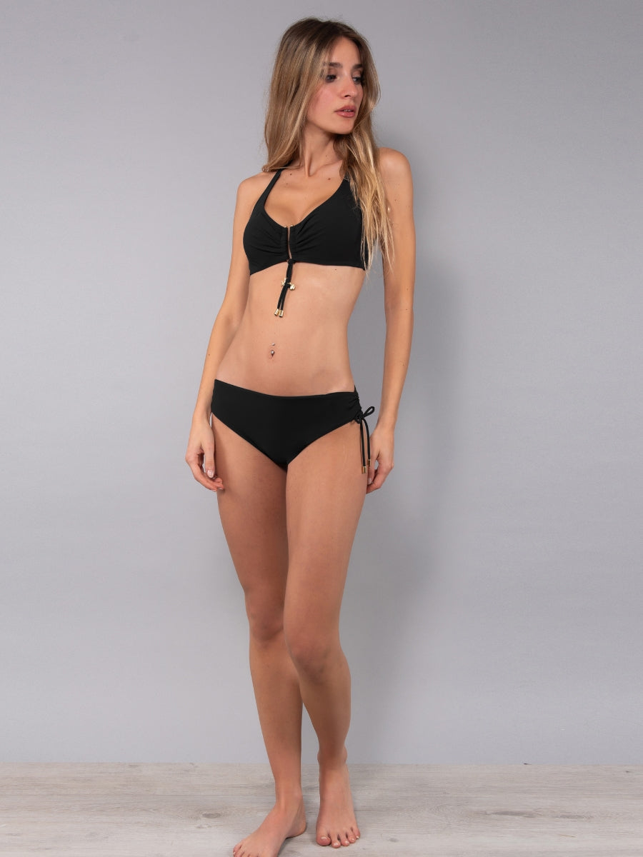 Triangolo senza imbottitura progettato per garantire comfort e sostegno alle coppe differenziate C e D. La struttura interna è dotata di ferretto invisibile che modella il décolleté, mentre l'assenza di imbottitura assicura una vestibilità naturale e comoda. Chiusura sul retro con gancio e spalline regolabili con allacciatura personalizzabile. Il design del costume da bagno è impreziosito da un elegante gancio metallico al centroseno e da accessori gold.