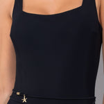 Costume intero modello olimpionico, progettato per offrire sostegno e valorizzare il décolleté, ideale per vestire le coppe differenziate C e D. Il design è definito da un moderno scollo quadrato e da una profonda scollatura sulla schiena che slancia la figura con eleganza. Il punto vita è impreziosito da una sottile cintura coordinata removibile, rifinita da accessori gold.