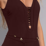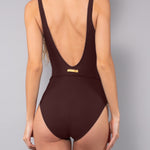 Costume intero non imbottito con ferretto, progettato per offrire sostegno e comfort ai décolleté più generosi, ideale per coppe differenziate C e D. La struttura interna è dotata di ferretto invisibile che modella il décolleté, mentre l'assenza di imbottitura assicura una vestibilità naturale e comoda. Il design del costume da bagno è caratterizzato da un incrocio di laccetti al centroseno e da una profonda scollatura sulla schiena. Il punto vita è impreziosito da una sottile cintura coordinata removibile, rifinita da accessori gold.