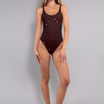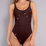 Costume intero modello olimpionico, progettato per offrire sostegno e valorizzare il décolleté, ideale per vestire le coppe differenziate C e D. Il design è definito da un scollo tondo e da una profonda scollatura sulla schiena che slancia la figura con eleganza. Il punto vita è impreziosito da una sottile cintura coordinata removibile, rifinita da accessori gold.