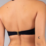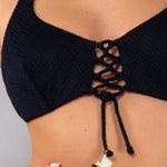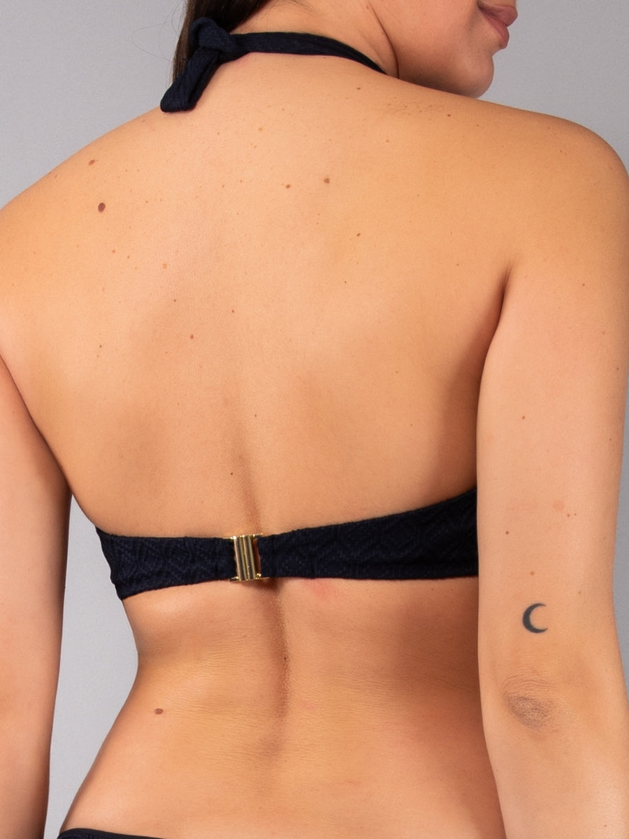 Triangolo senza imbottitura progettato per garantire comfort e sostegno alle coppe differenziate C, D, E. La struttura interna è dotata di ferretto invisibile che modella il décolleté, mentre l'assenza di imbottitura assicura una vestibilità naturale e comoda. Chiusura sul retro con gancio e spalline larghe con asola finale che consentono una doppia allacciatura. Il design del costume da bagno è completato dal centroseno con incrocio di laccetti, accessori gold e perline.